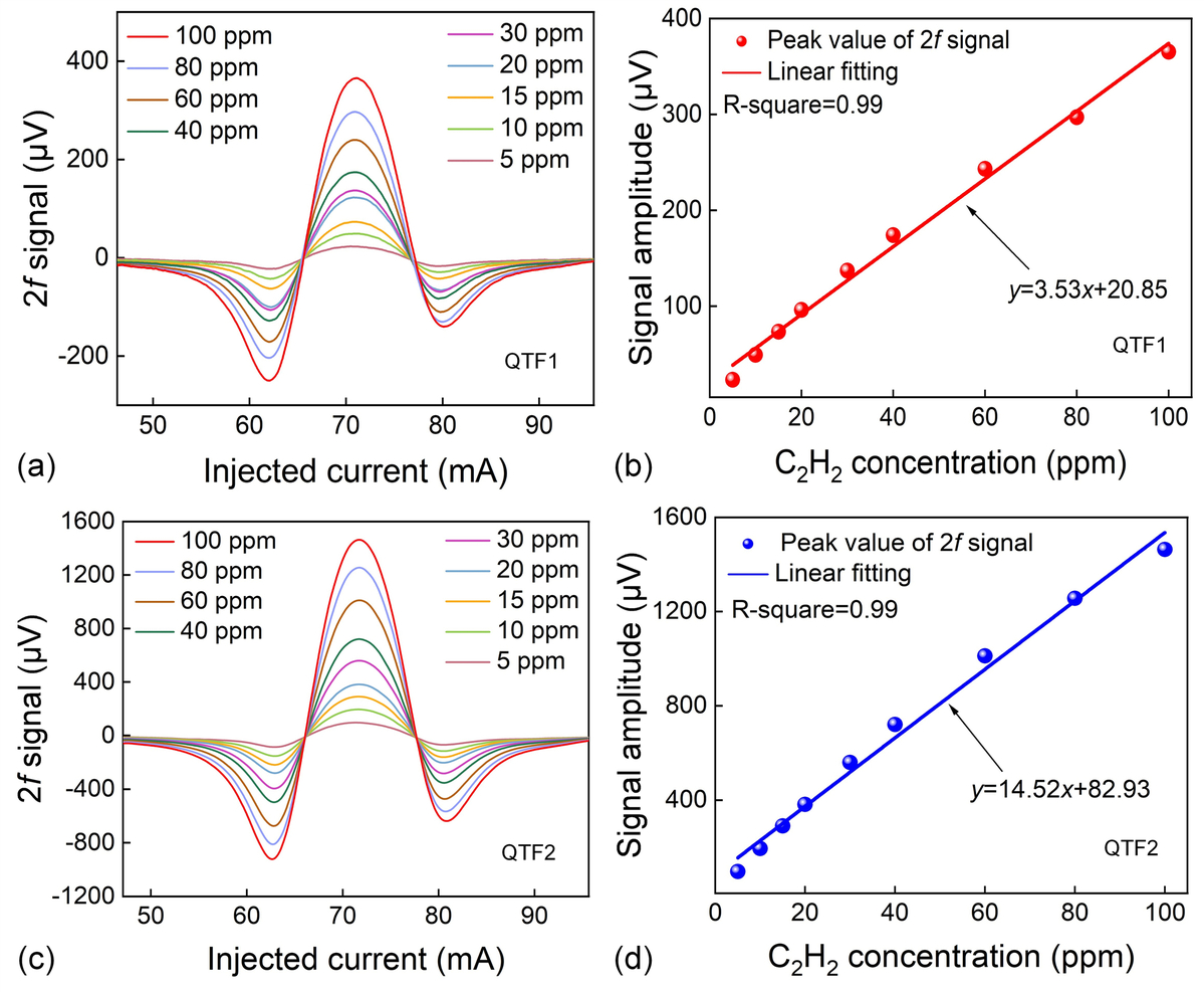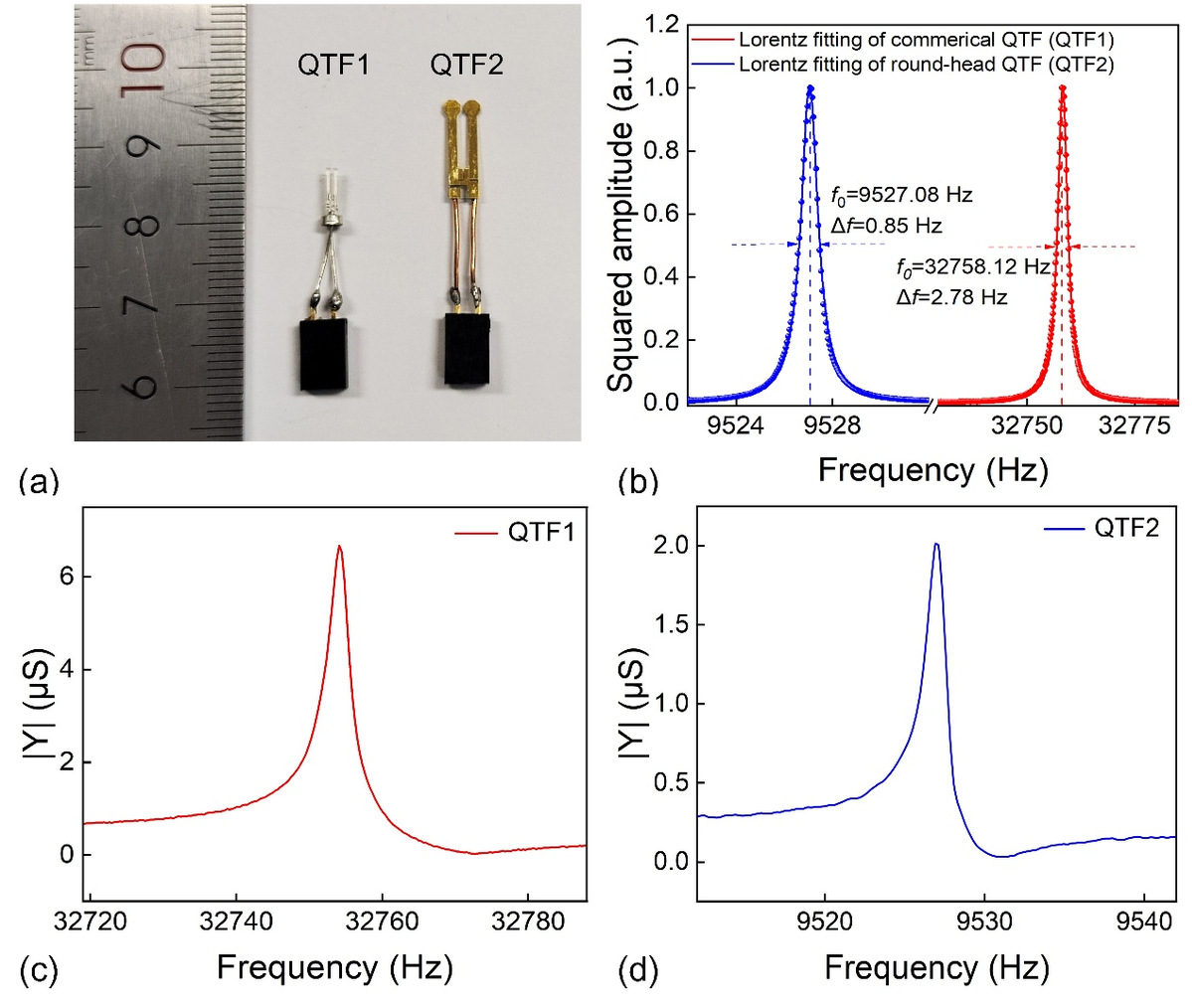 同时,针对LITES系统中商用石英音叉存在共振频率偏高、信号响应微弱的不足,课题组自主设计了圆形头低频石英音叉。通过圆头结构优化,该器件的整体重心得到合理调控,振动过程中的力矩显著增加,有效提升了电荷产生率,加之其更低的共振频率能够延长能量积累时间,进一步增强了信号输出幅度。实验数据显示,与传统商用石英音叉相比,定制化圆形头石英音叉可使LITES系统信号幅度提升约4倍,信噪比提升约3倍。该研究通过“多目标优化算法设计高性能多通池”与“定制化低频石英音叉”的协同创新,实现了LITES系统的吸收增强与探测增强双重目标,为提升激光气体传感技术灵敏度提供了全新的技术路径与解决方案。